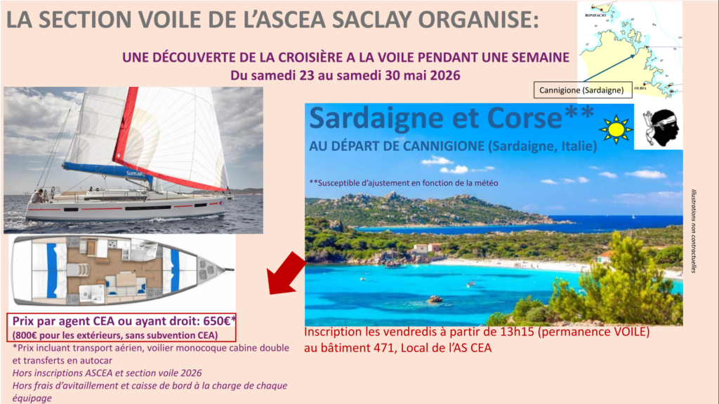 Le nombre de places étant limité, nous vous invitons à vous engager au plus tôt si vous êtes intéressés. La section Voile décide de donner la priorité d’inscription aux agents CEA et ayant droits. Le versement de l’acompte valide l’inscription.